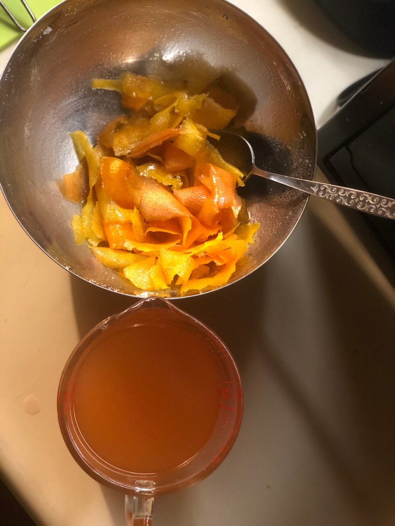 - This time I let everything (the peels, the juice, and the sugar) sit together in the fridge overnight. I wanted to get the bitterness from the peels.