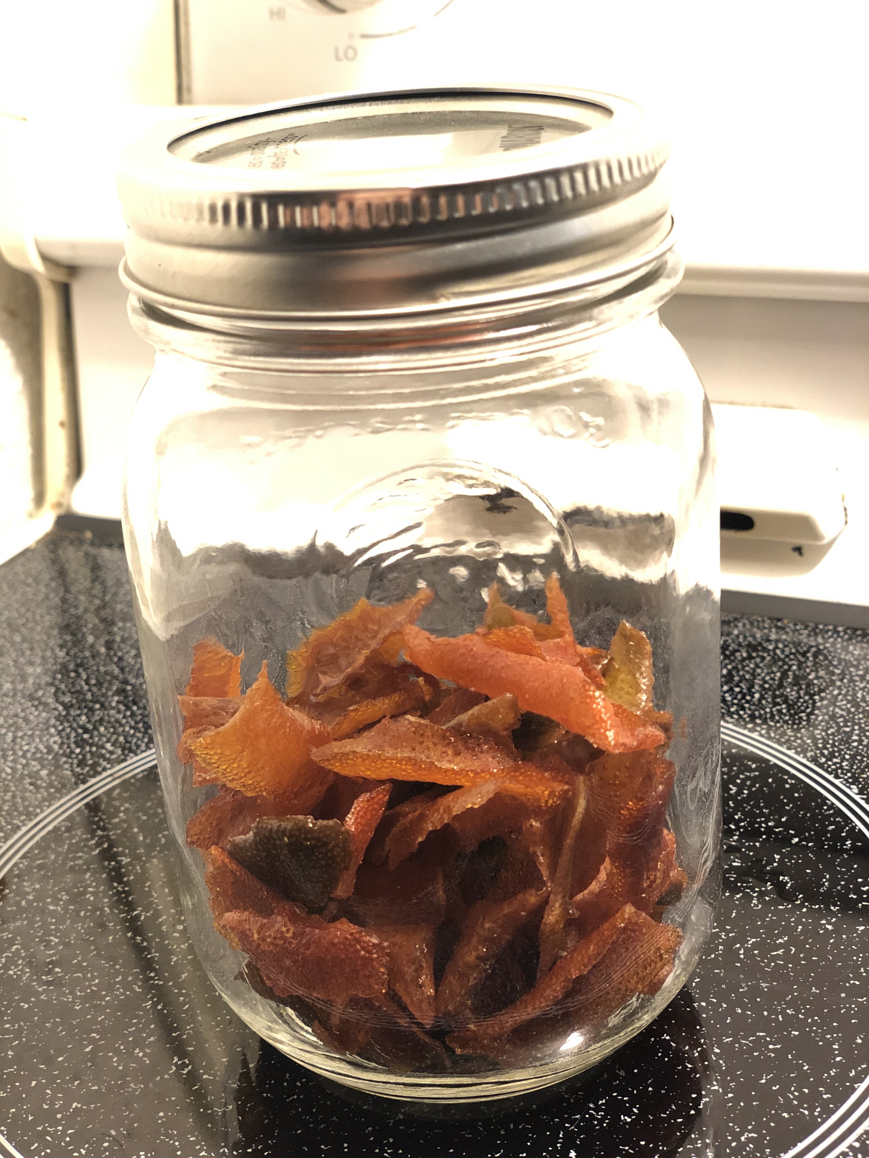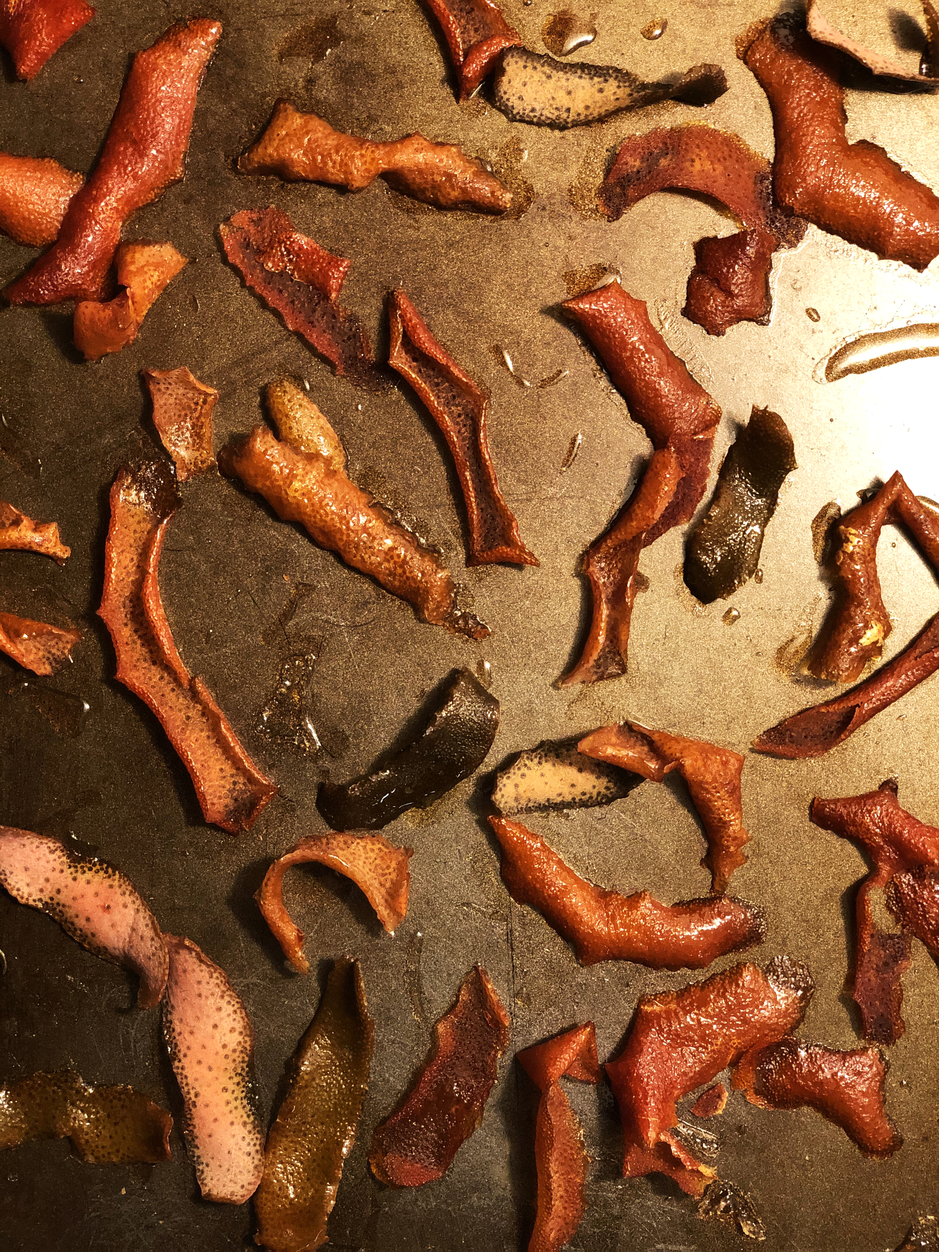 Dehydrating the peels in the oven was an experiment that I’m glad panned out. It’s a nice bitter-citrus, sour flavour. I think if you wanted them to be more candy-like you could coat them in granulated sugar. If you wanted them soft, less like a hard candy consistency, take them out of the oven sooner.